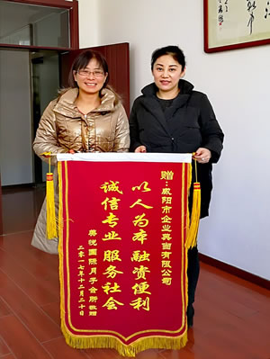 2017年12月20日下午,天氣晴朗,陽(yáng)光明媚,咸陽(yáng)美悅國際月子會(huì )所負責人來(lái)到咸陽(yáng)市企業(yè)典當有限公司,贈送印有“以人為本、融資便利、誠信專(zhuān)業(yè)、服務(wù)社會(huì )”的錦旗,以此感謝企業(yè)典當公司給予的大力支持和幫助。