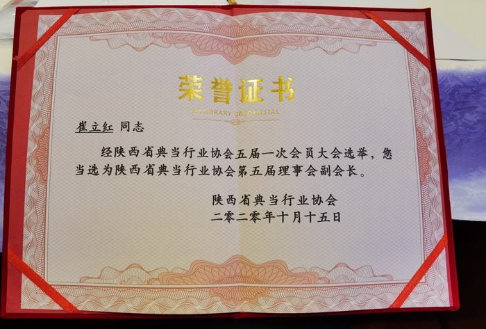 10月15日,陜西省典當行業(yè)協(xié)會(huì )五屆一次會(huì )議在西安人民大廈隆重召開(kāi),大會(huì )選舉產(chǎn)生了省典協(xié)新一屆會(huì )長(cháng)單位、副會(huì )長(cháng)單位,并舉行授牌儀式。咸陽(yáng)市企業(yè)典當有限公司成功當選省典協(xié)理事會(huì )副會(huì )長(cháng)單位,公司董事長(cháng)崔立紅同志當選為副會(huì )長(cháng)。