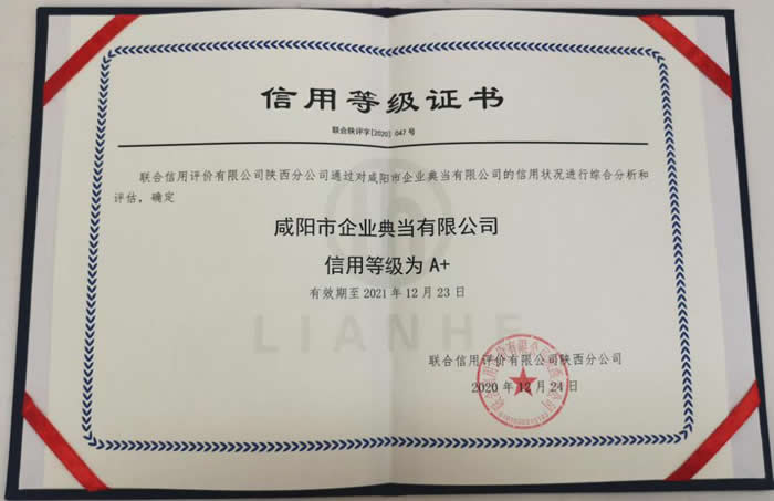 新年伊始,萬(wàn)象更新,喜訊傳來(lái)。經(jīng)“中國誠信信用管理股份有限公司陜西分公司信用評級委員會(huì )”審定,授予我公司2020年度企業(yè)資信等級為A+級并頒發(fā)資信等級證書(shū)。